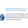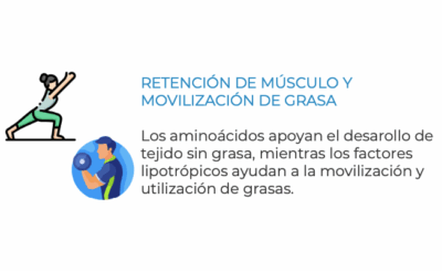 - Favorece la retención de músculo y la movilización de grasa. Los aminoácidos apoyan el desarollo de tejido sin grasa, mientras los factores lipotrópicos ayudan a la movilización y utilización de grasas.