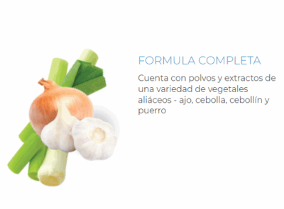 - 4,200mcg de alicina proveniente del polvo de ajo puro en cada porción, con compuestos bioactivos provenientes de las cebollas, cebollinos, y el puerro.