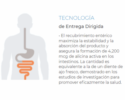 - Tecnología de entrega exclusiva lleva la alicina directamente a su intestino, eliminando el regusto y maximizando la absorción.